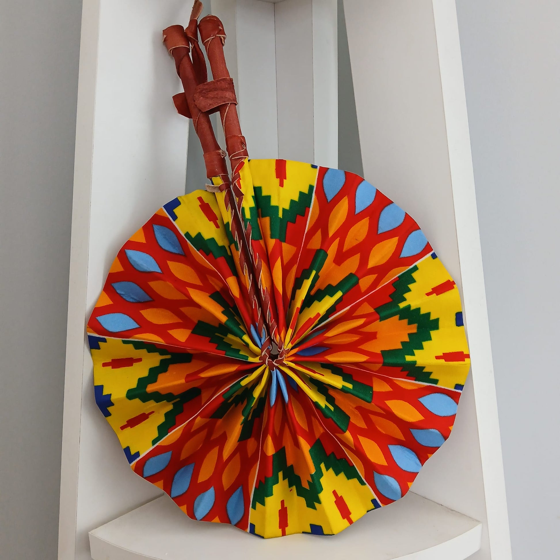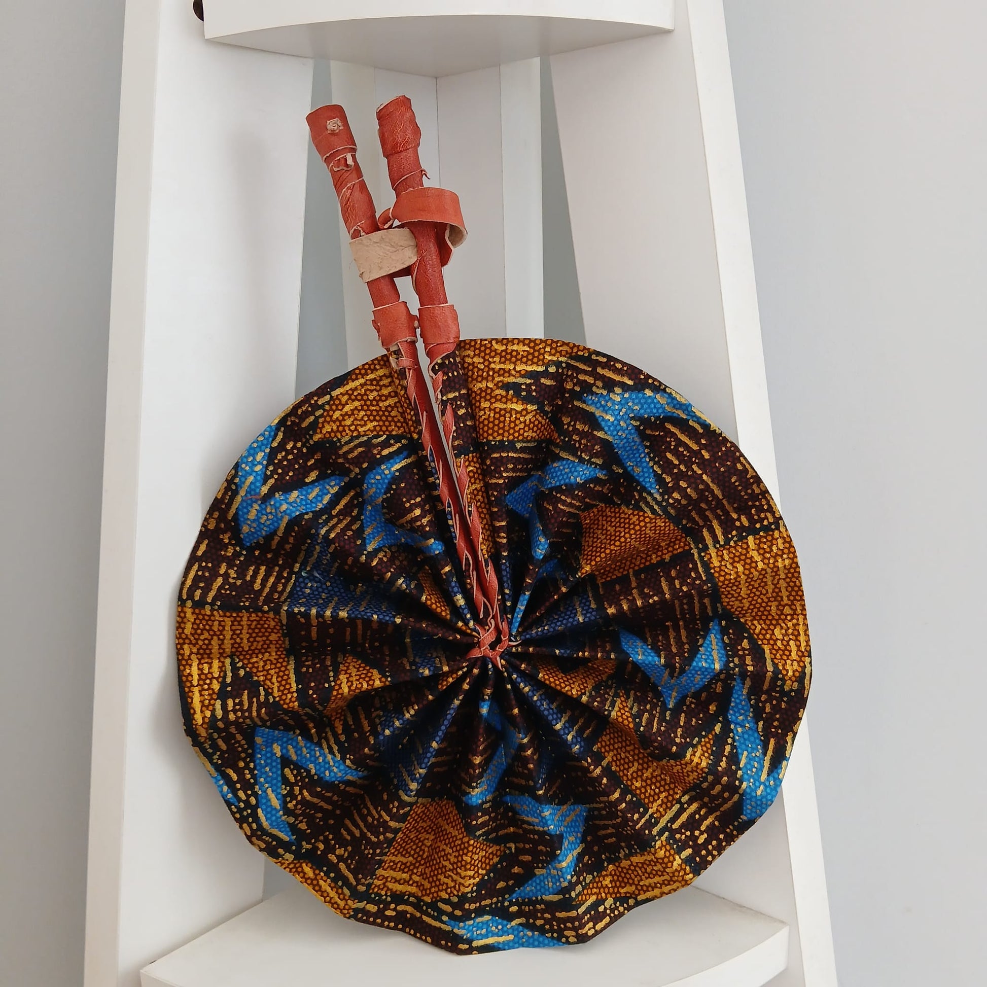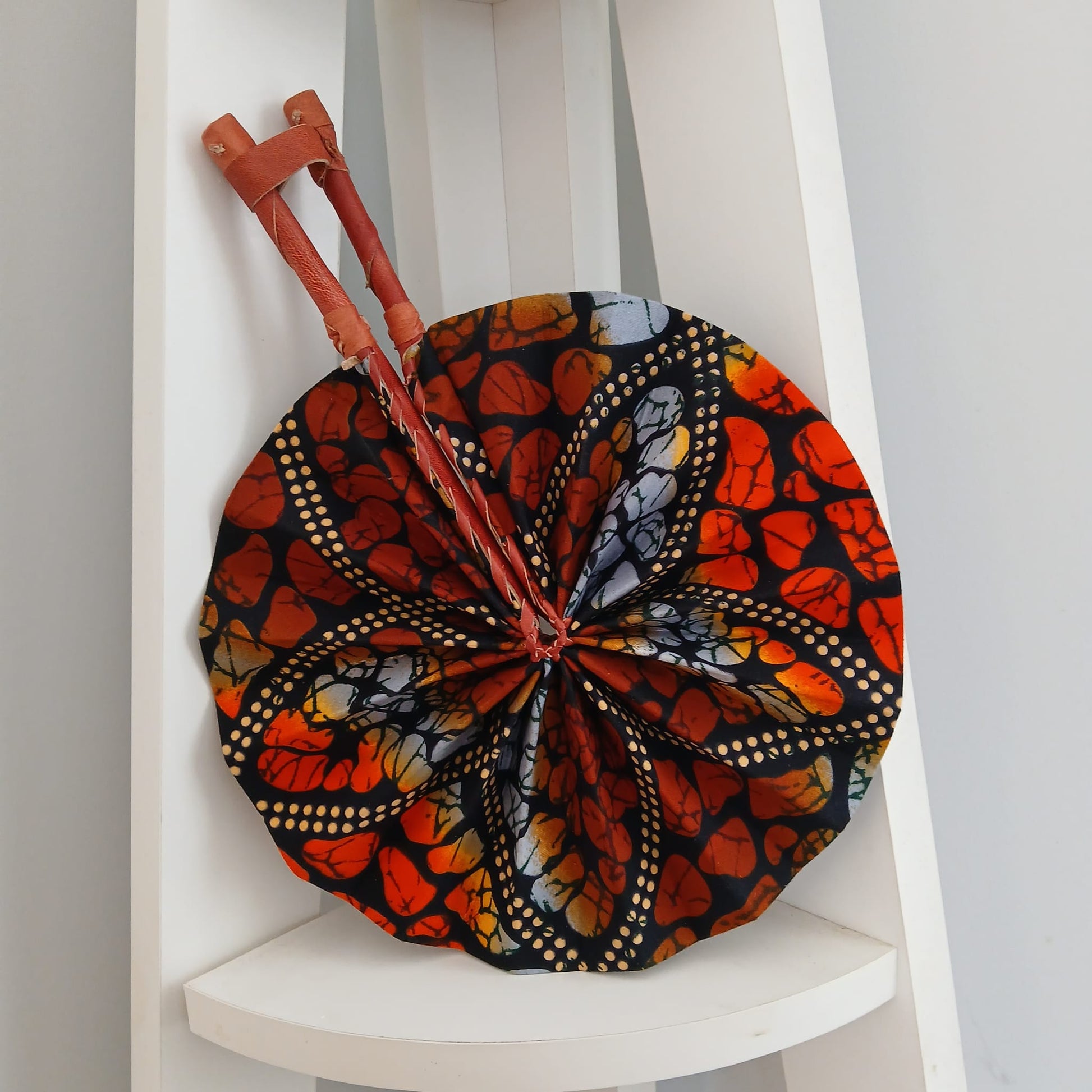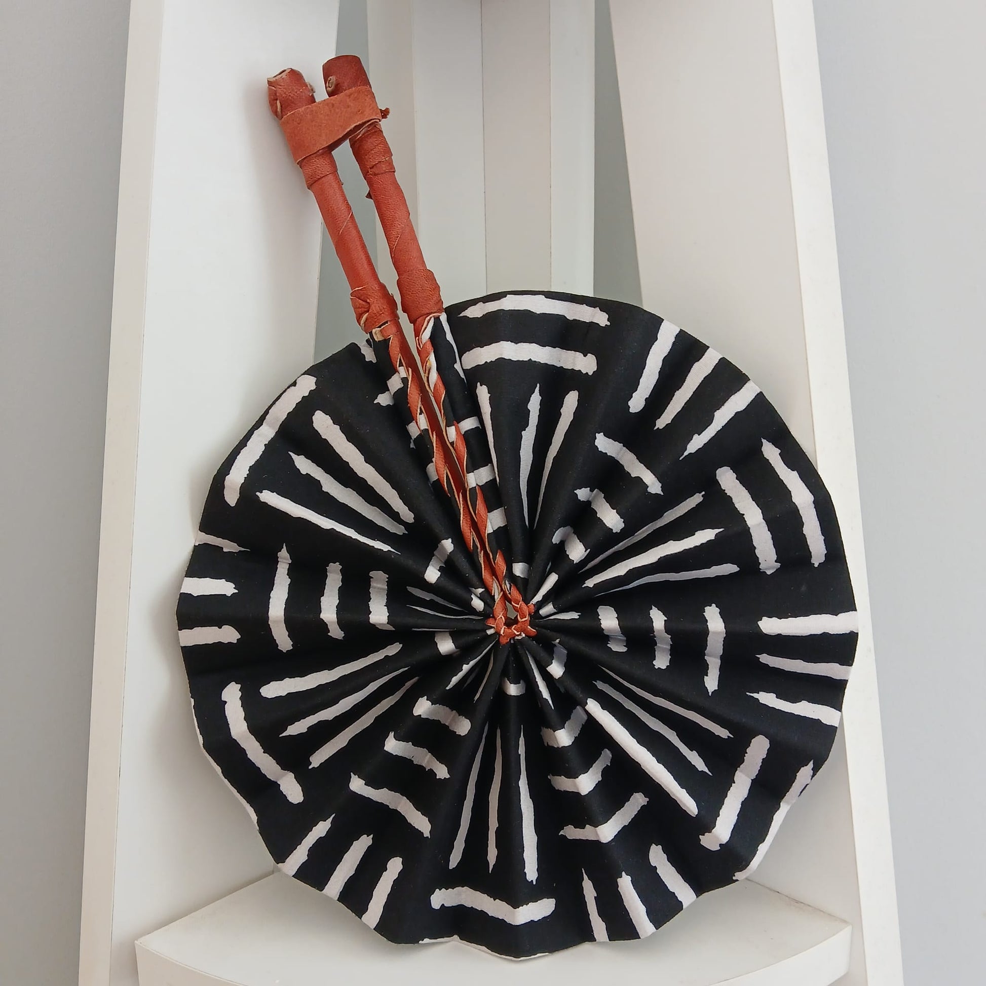 Handmade in Ghana, these fans with pure leather and African fabric are stunning. Versatile like other Kelis Africa accessories, they can be hung, placed in vases or wine bottles, customized with a name tag, and folded/tied to avoid opening in your bag. Dimensions:14-15" opened, 8.5-9" closed.