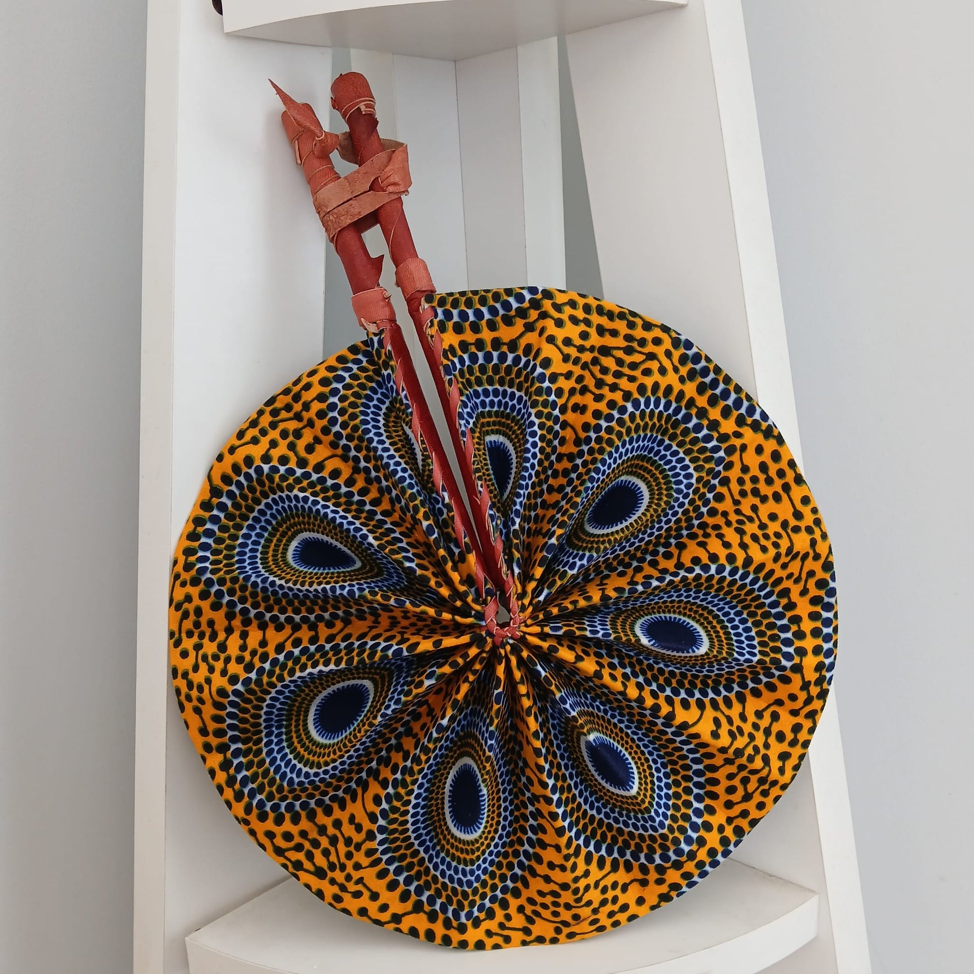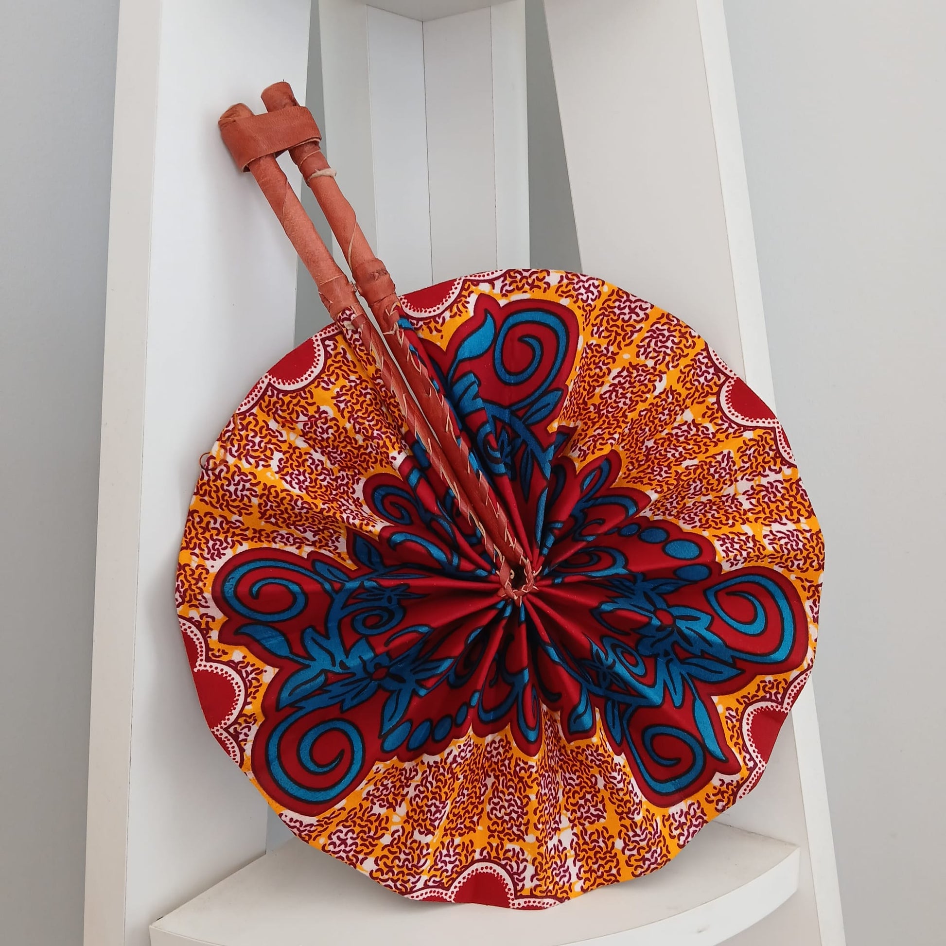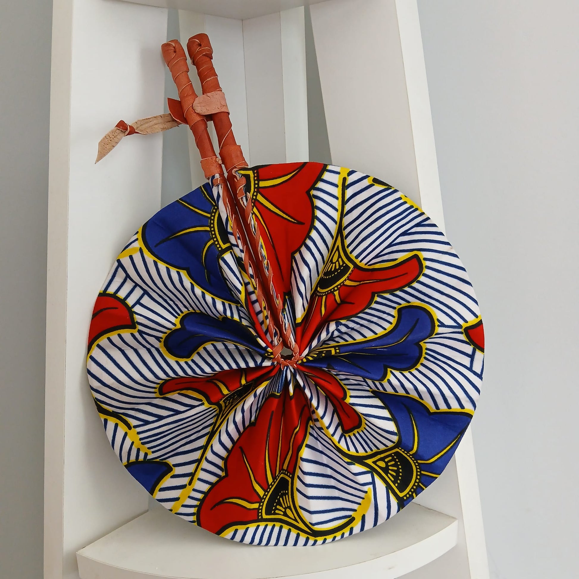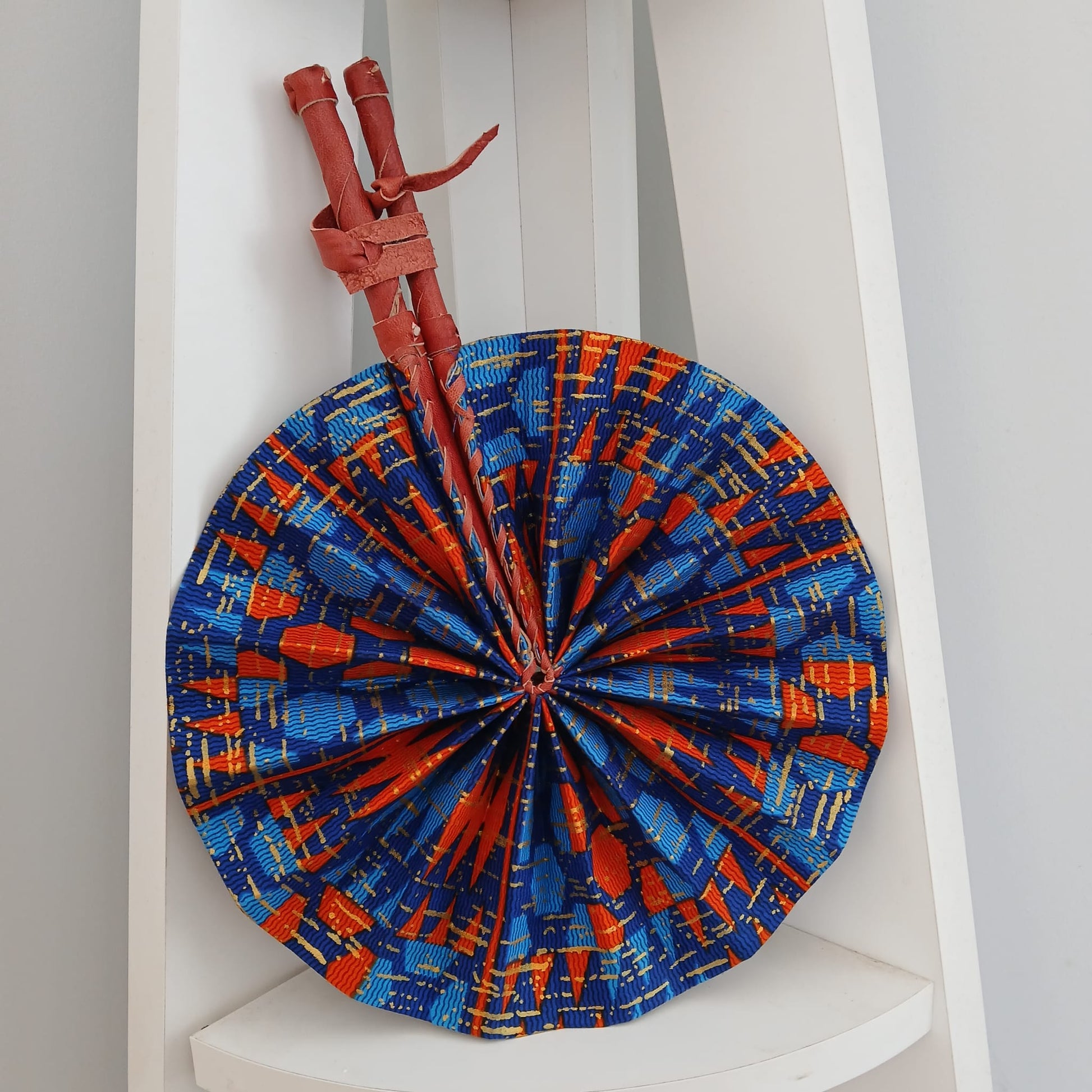 Handmade in Ghana, these fans with pure leather and African fabric are stunning. Versatile like other Kelis Africa accessories, they can be hung, placed in vases or wine bottles, customized with a name tag, and folded/tied to avoid opening in your bag. Dimensions:14-15" opened, 8.5-9" closed.