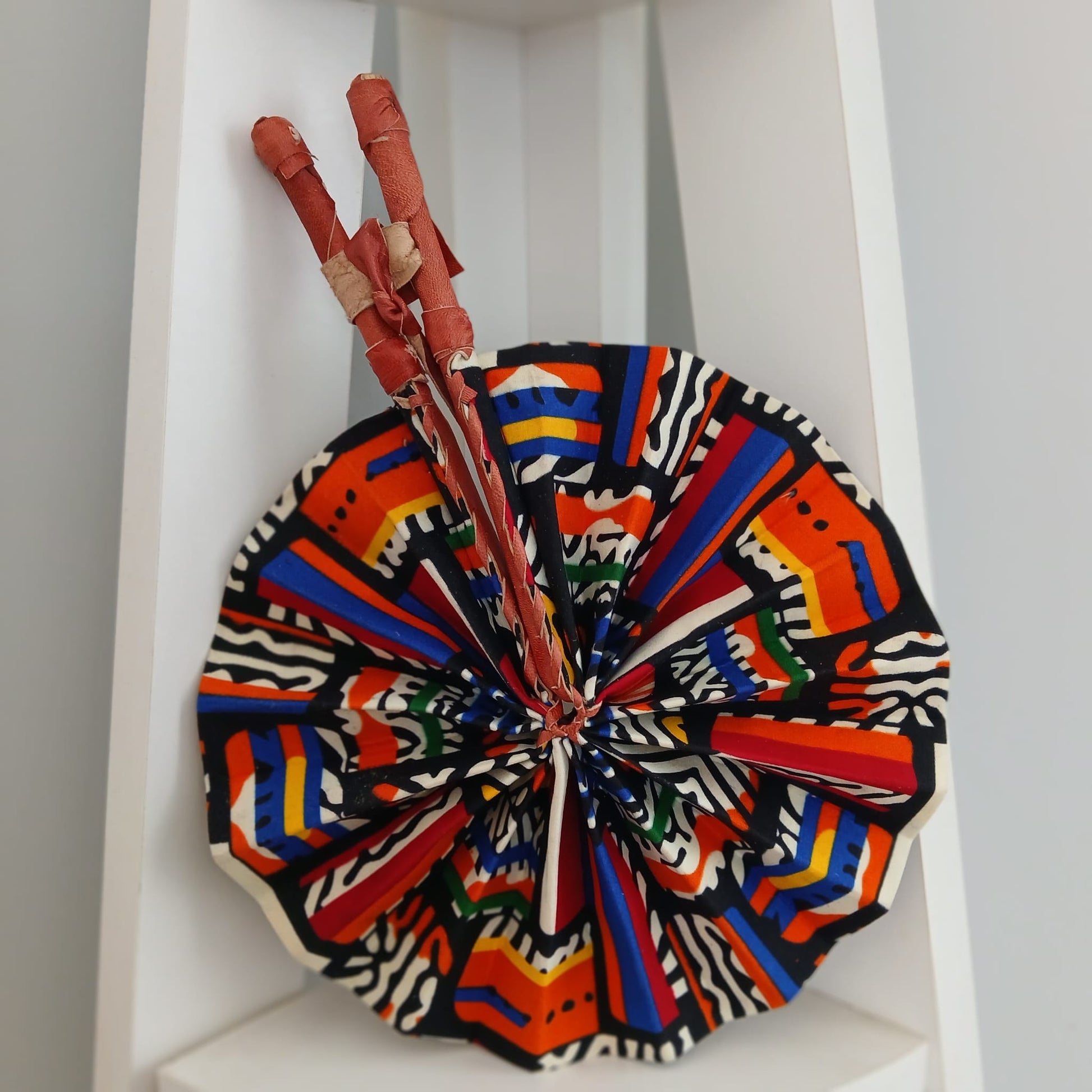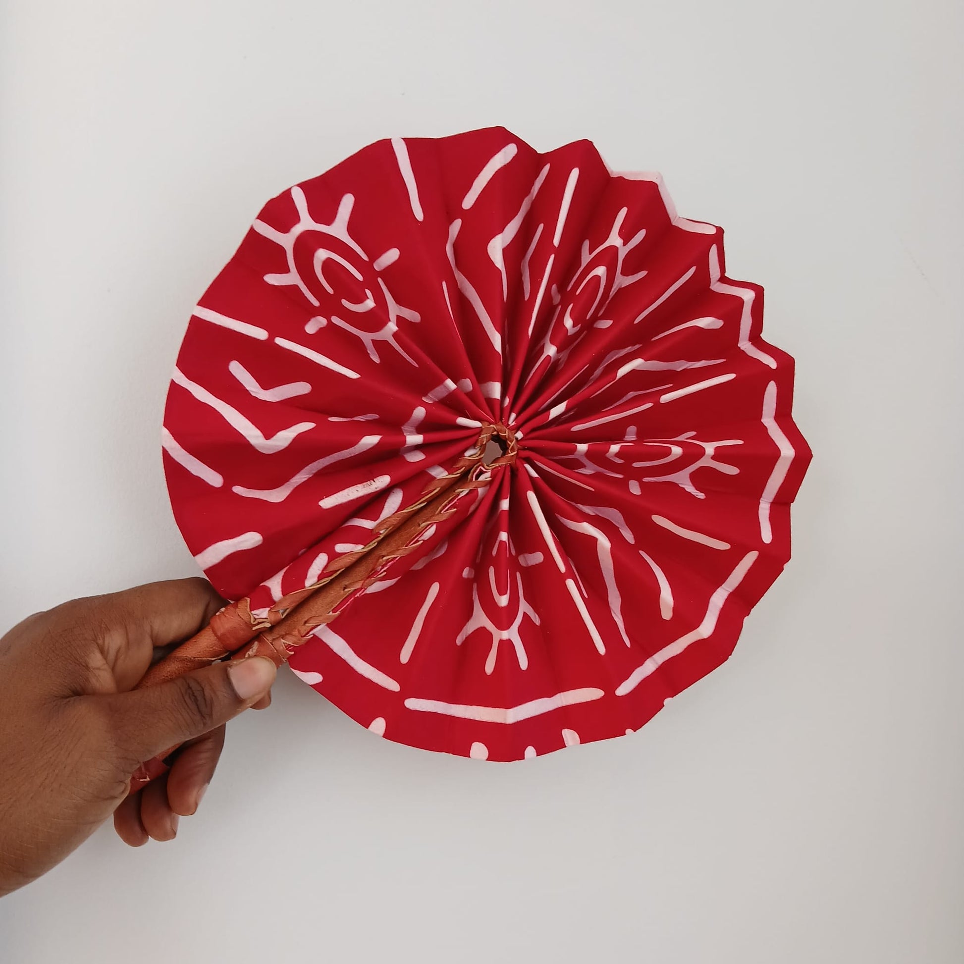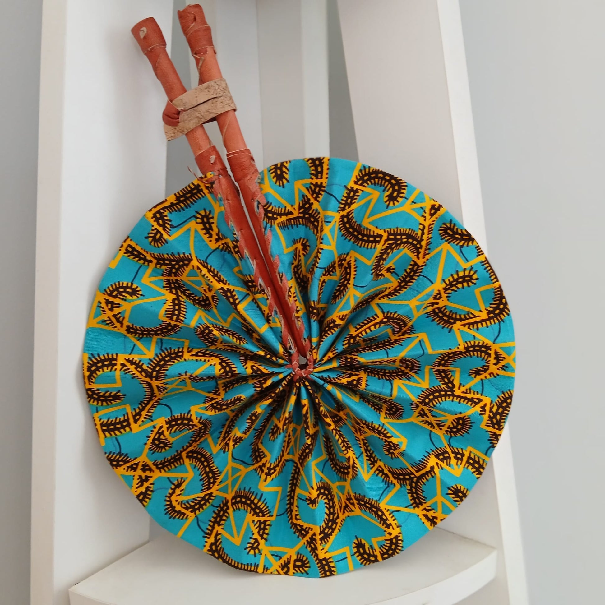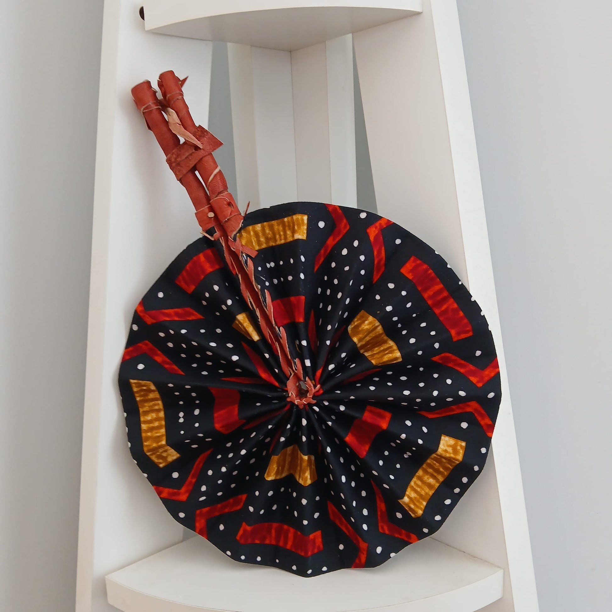 Handmade in Ghana, these fans with pure leather and African fabric are stunning. Versatile like other Kelis Africa accessories, they can be hung, placed in vases or wine bottles, customized with a name tag, and folded/tied to avoid opening in your bag. Dimensions:14-15" opened, 8.5-9" closed.
