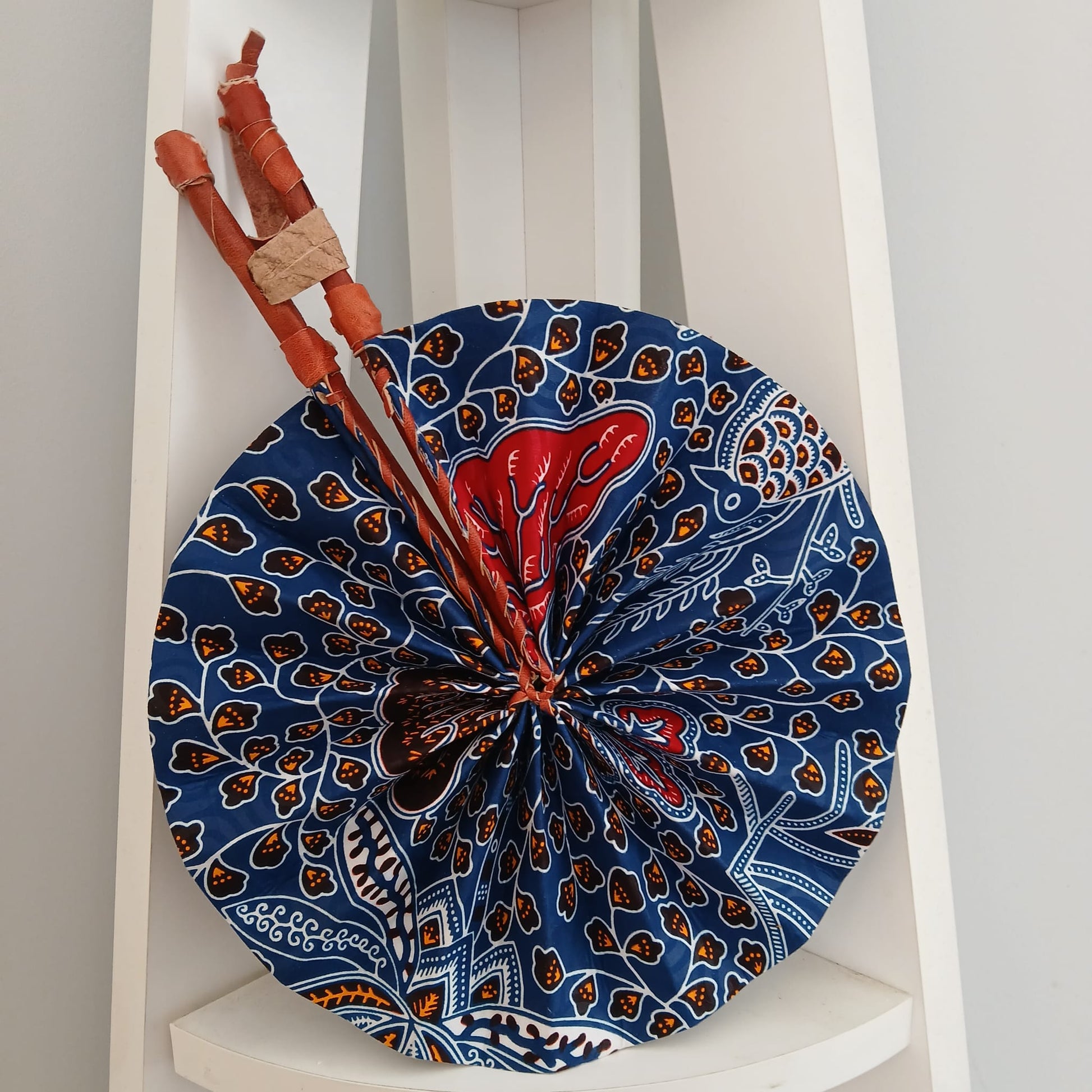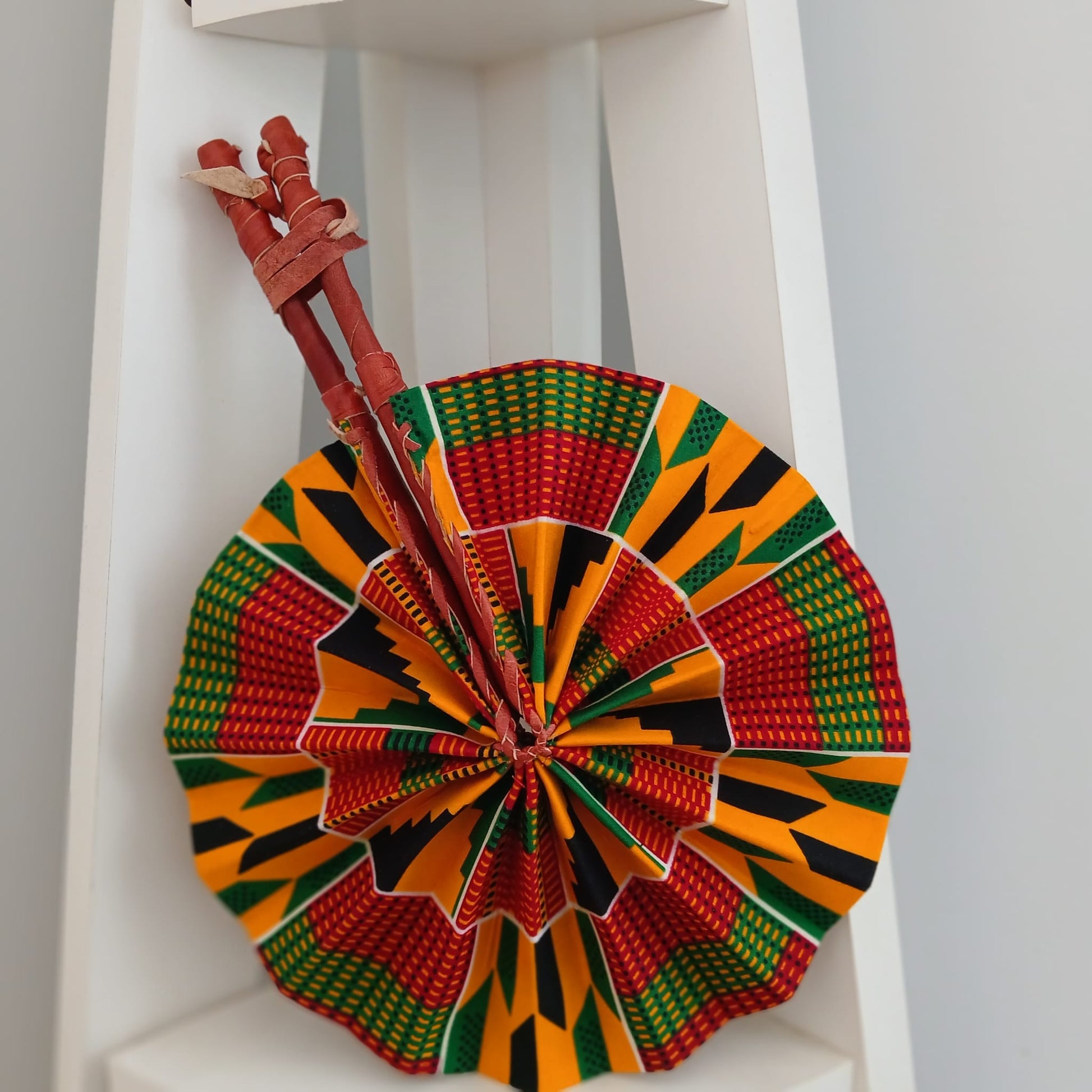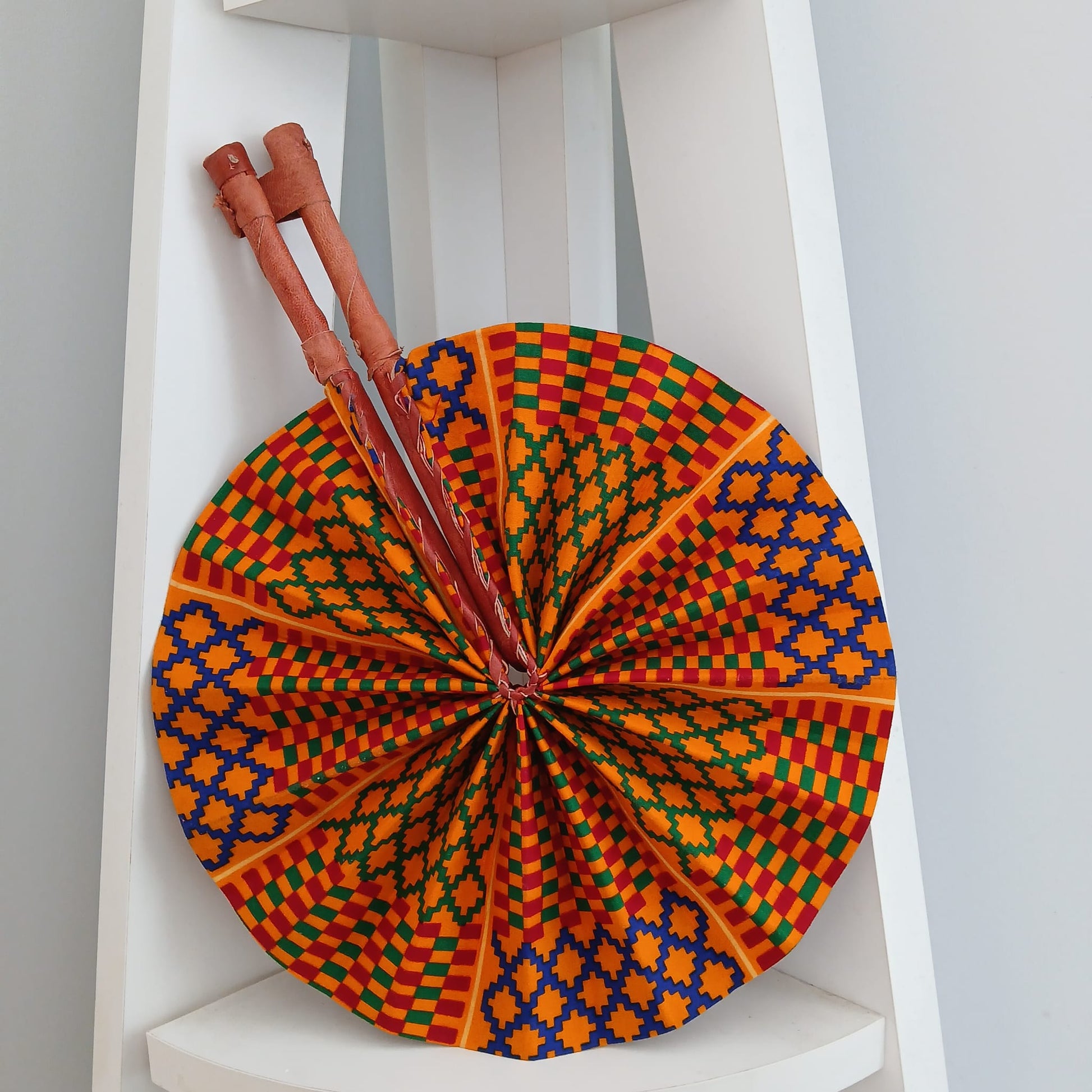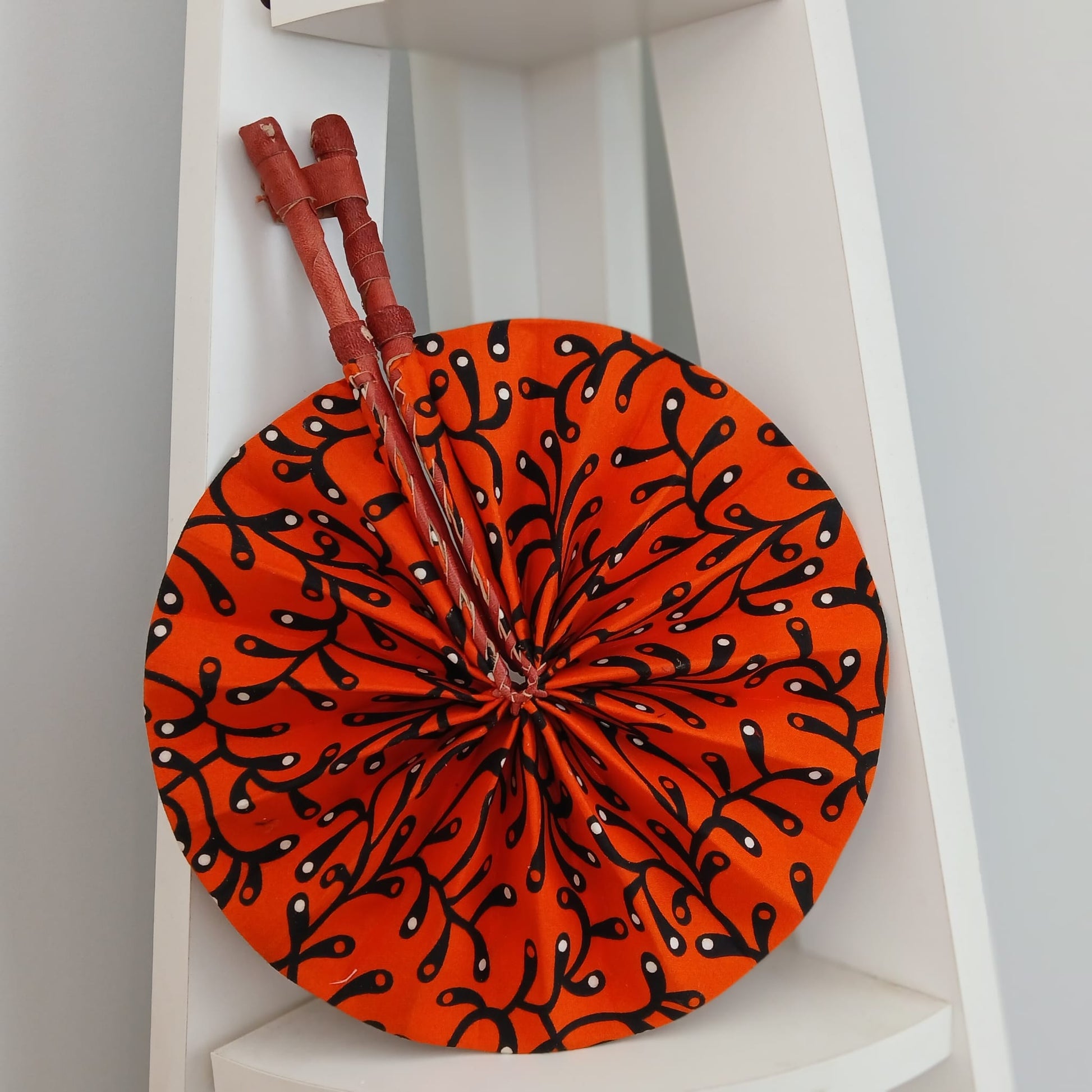 Handmade in Ghana, these fans with pure leather and African fabric are stunning. Versatile like other Kelis Africa accessories, they can be hung, placed in vases or wine bottles, customized with a name tag, and folded/tied to avoid opening in your bag. Dimensions:14-15" opened, 8.5-9" closed.