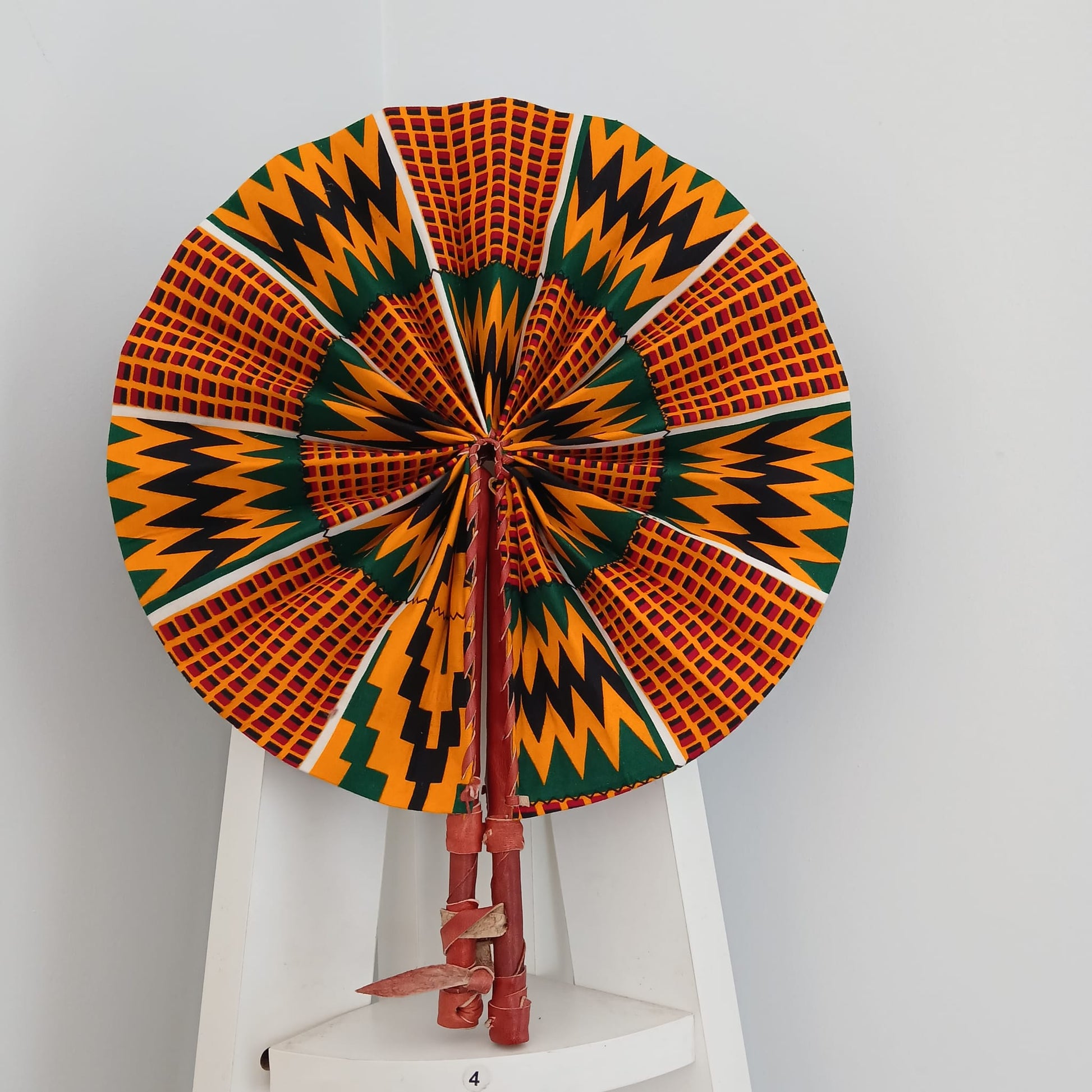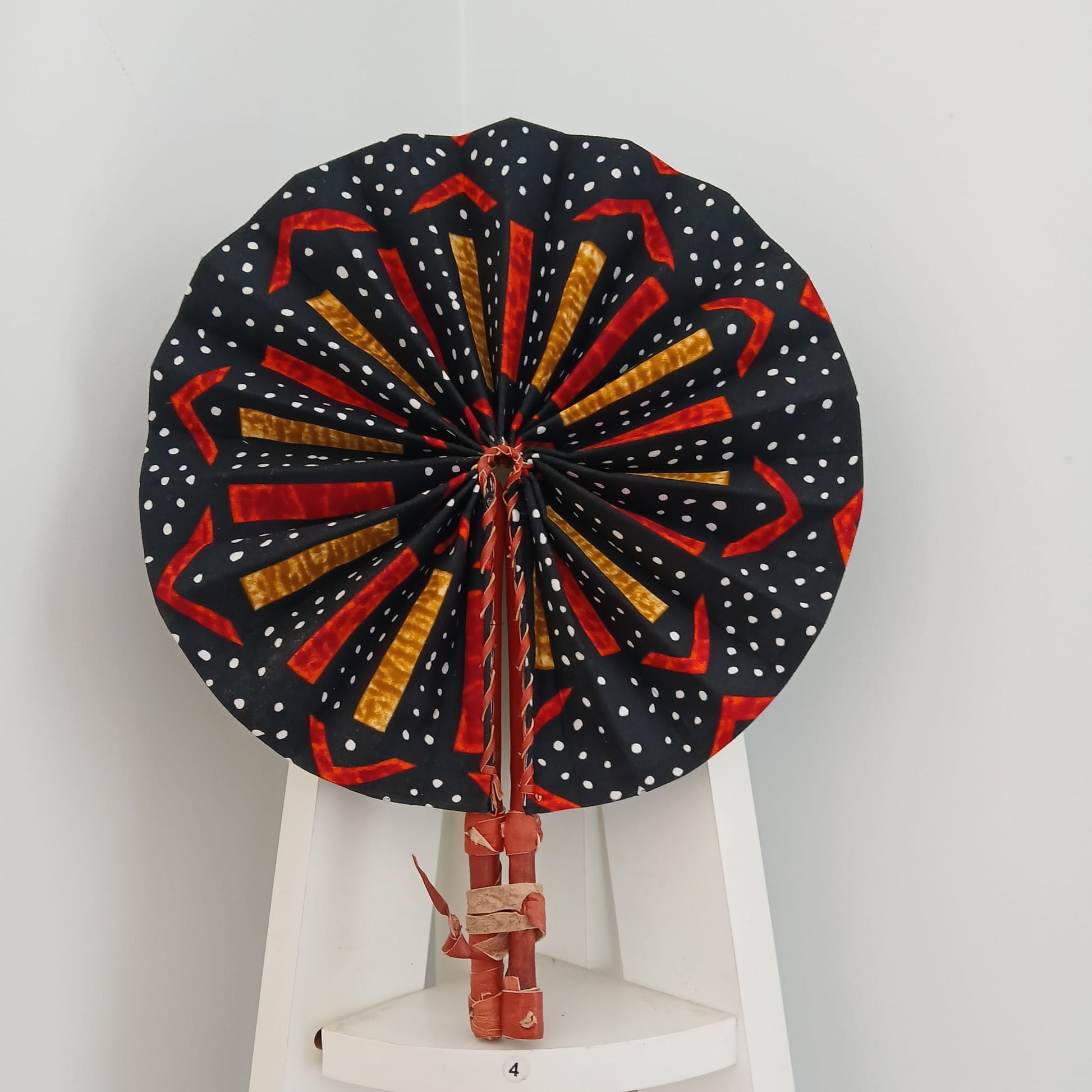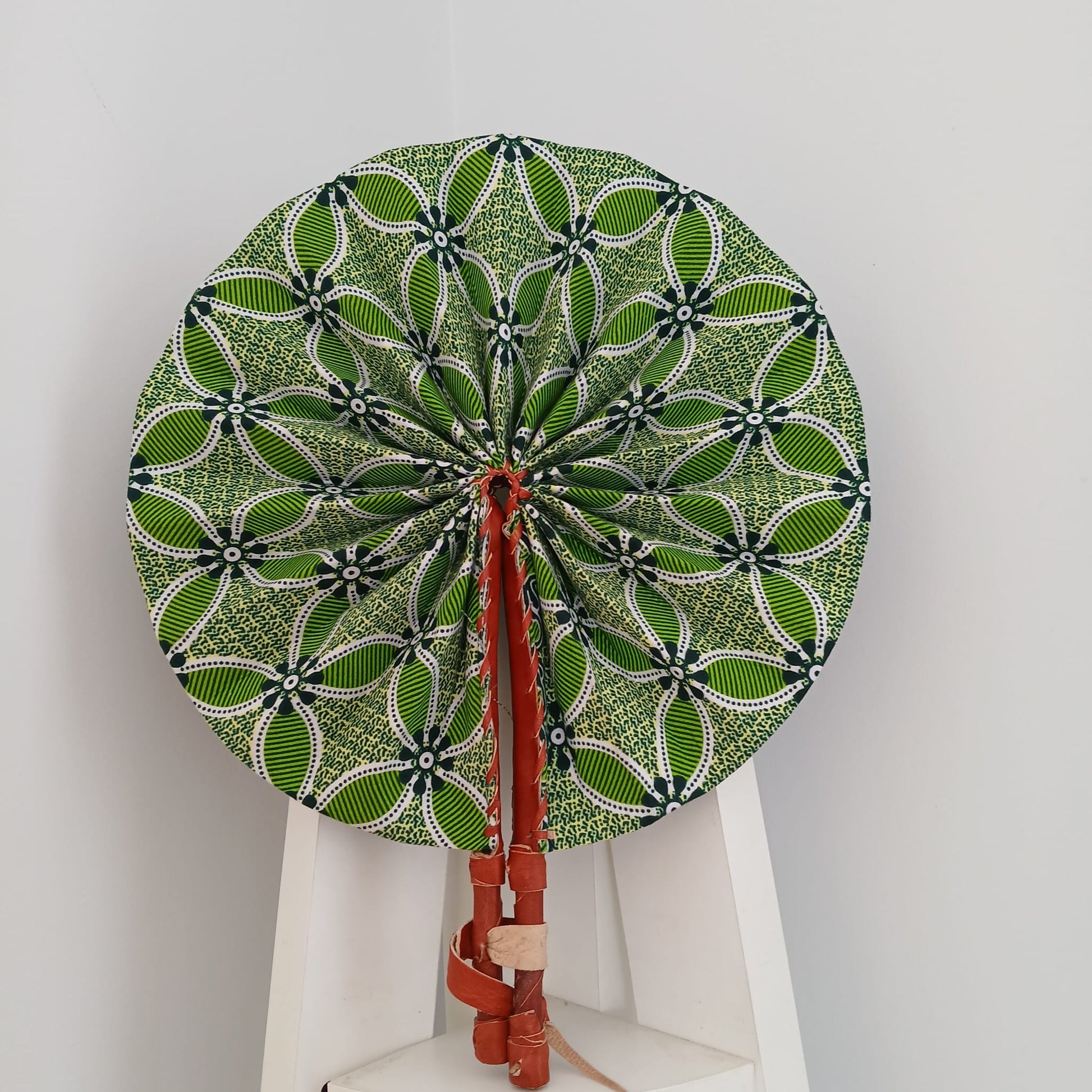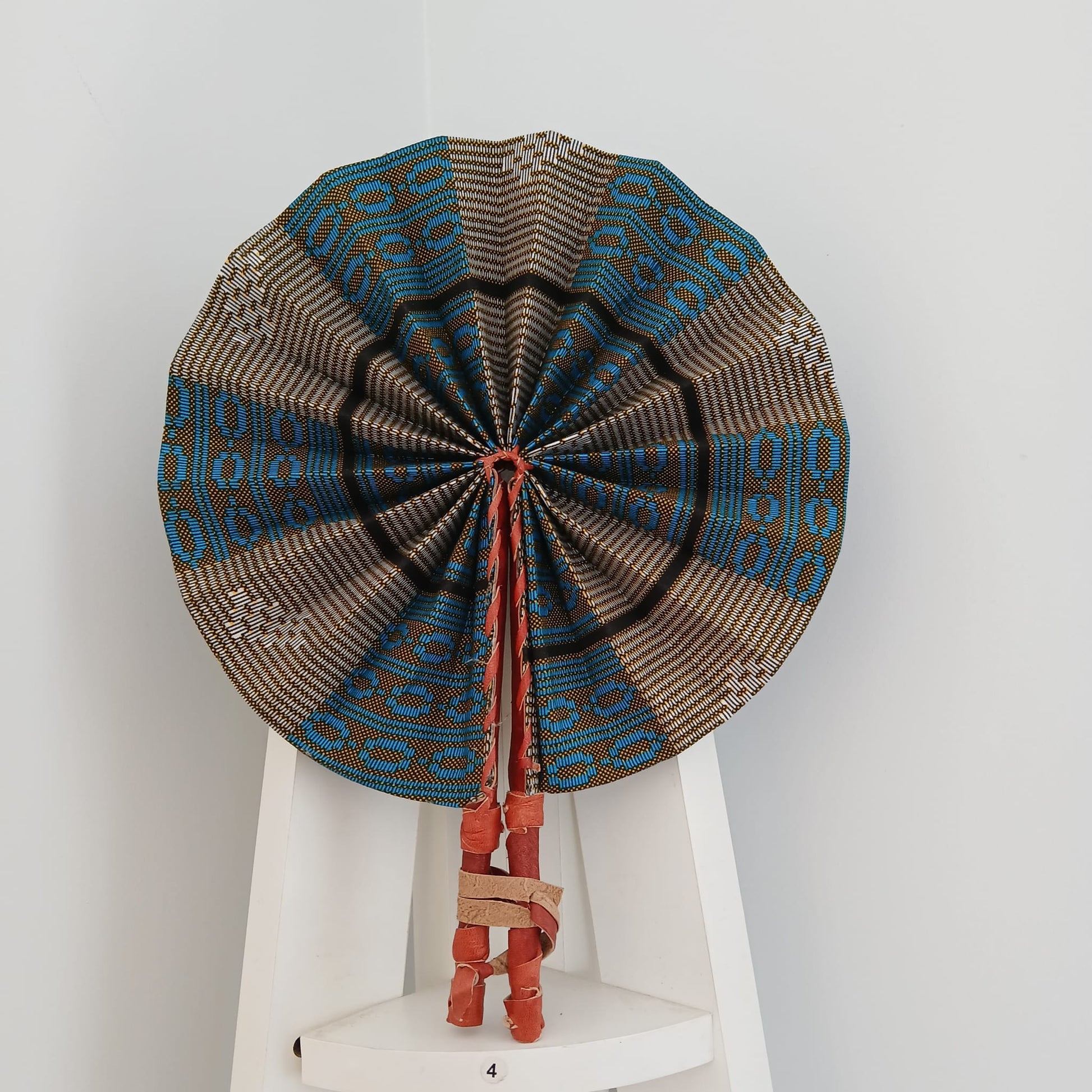 Handmade in Ghana, these fans are a mix of leather and African print fabric. Versatile, they can be hung as wall décor, placed in vases or bottles, and can be used as placeholders with name tags. Fold-able and tied, they stay closed in your handbag. Size: 14-15" open, 8.5-9" closed.
