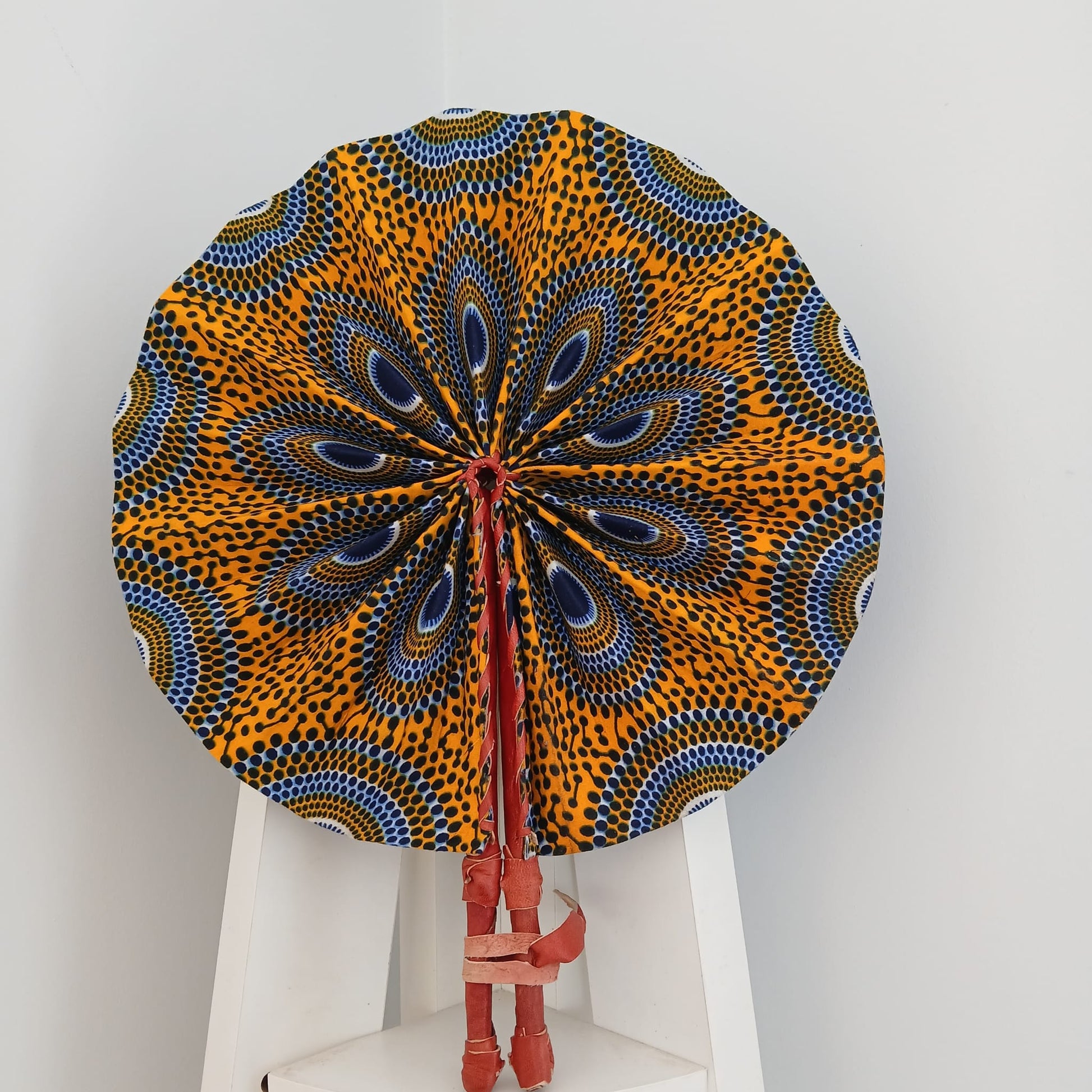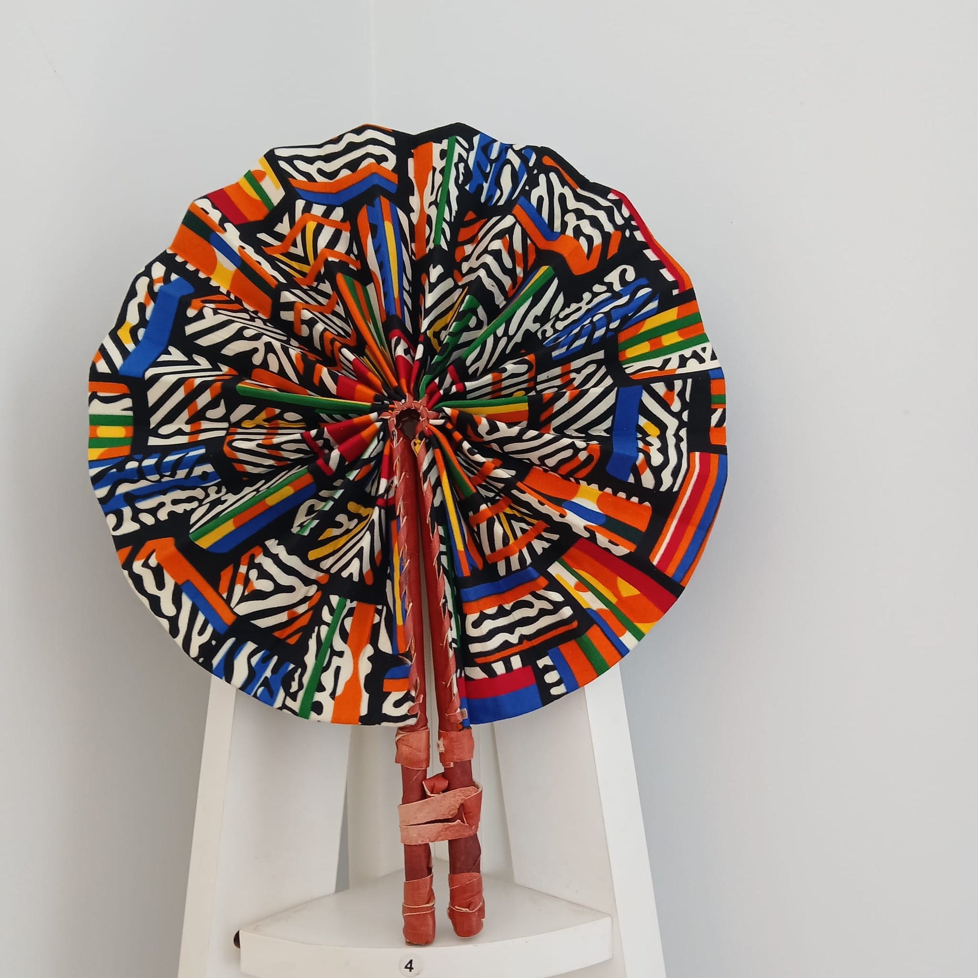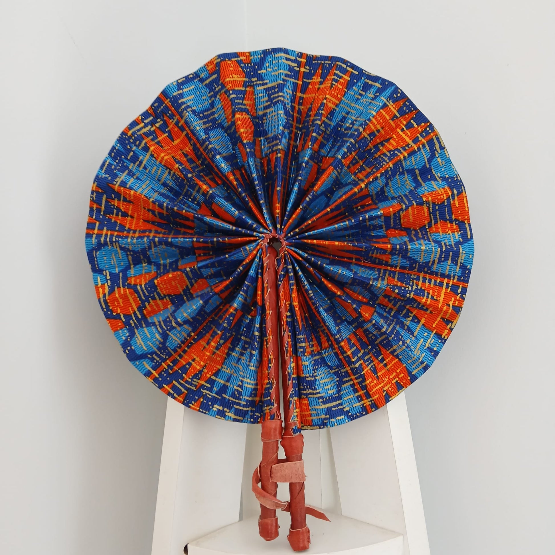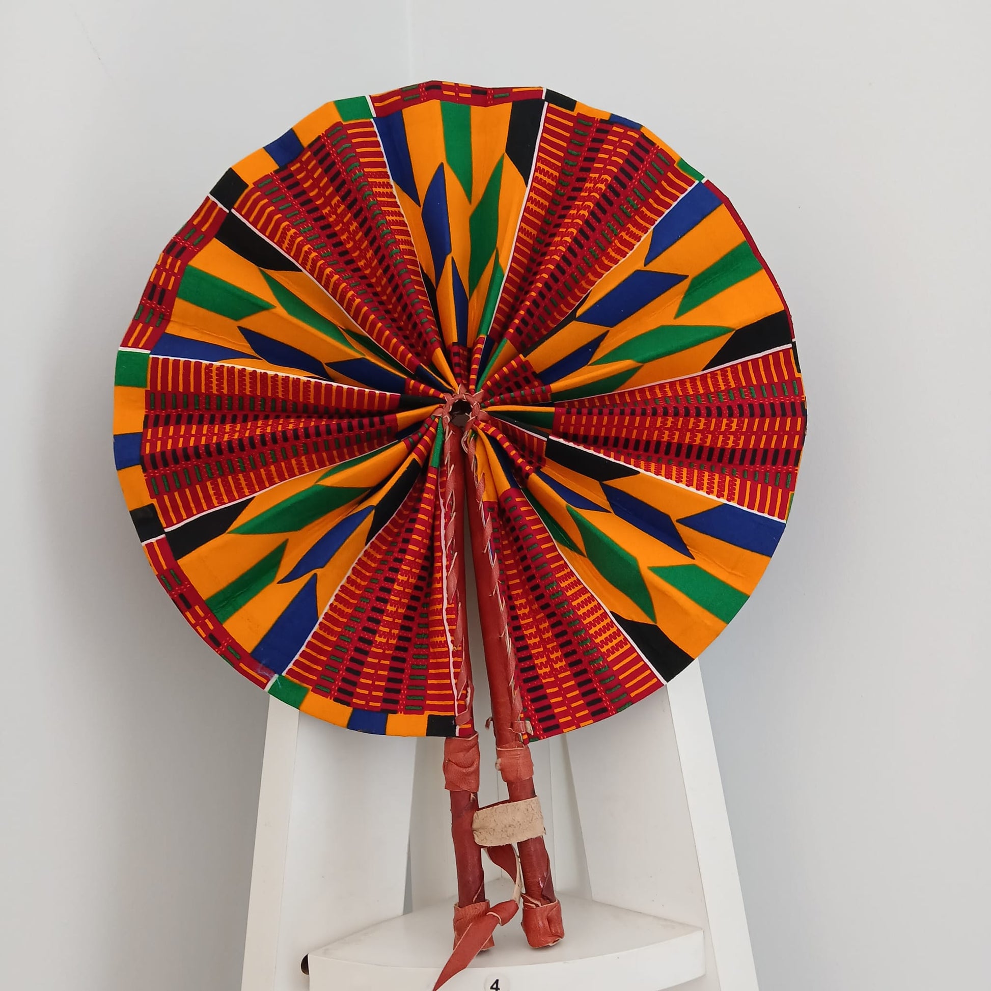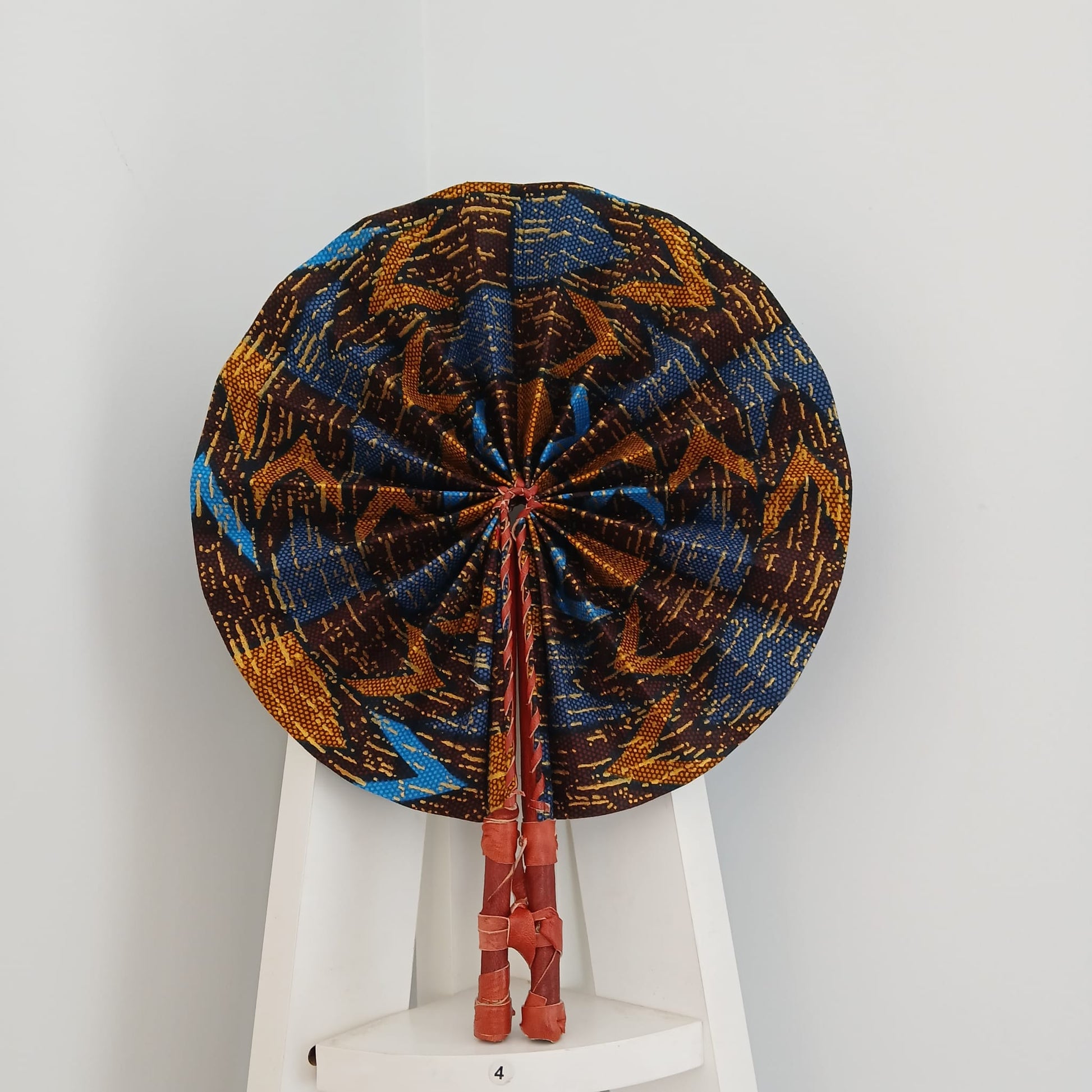Handmade in Ghana, these fans are a mix of leather and African print fabric. Versatile, they can be hung as wall décor, placed in vases or bottles, and can be used as placeholders with name tags. Fold-able and tied, they stay closed in your handbag. Size: 14-15" open, 8.5-9" closed.
