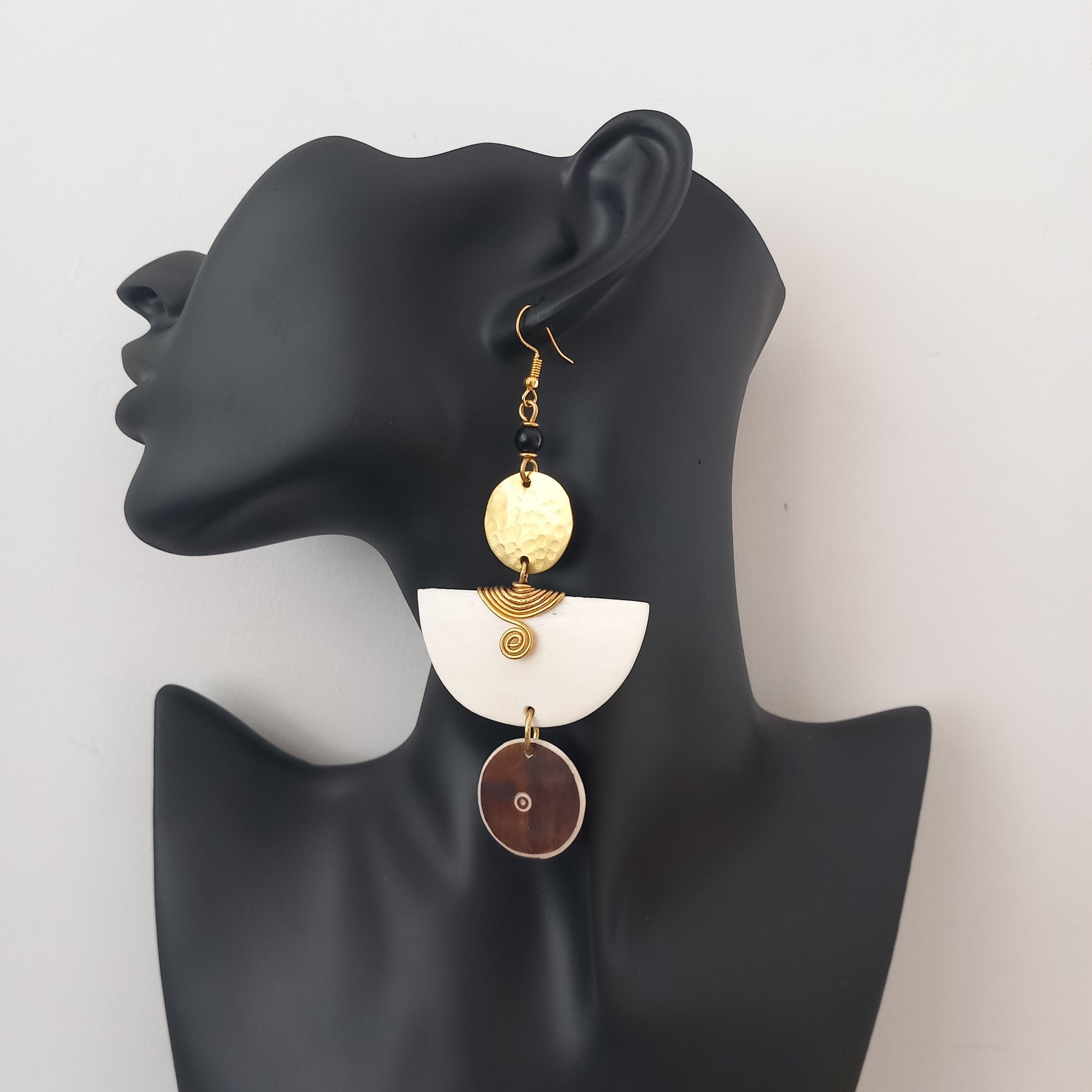 These elegant bone and brass drop earrings feature simple, timeless design that works with any ensemble. The white bone pendant gives the earrings a sophisticated, modern touch. Perfect for any occasion.