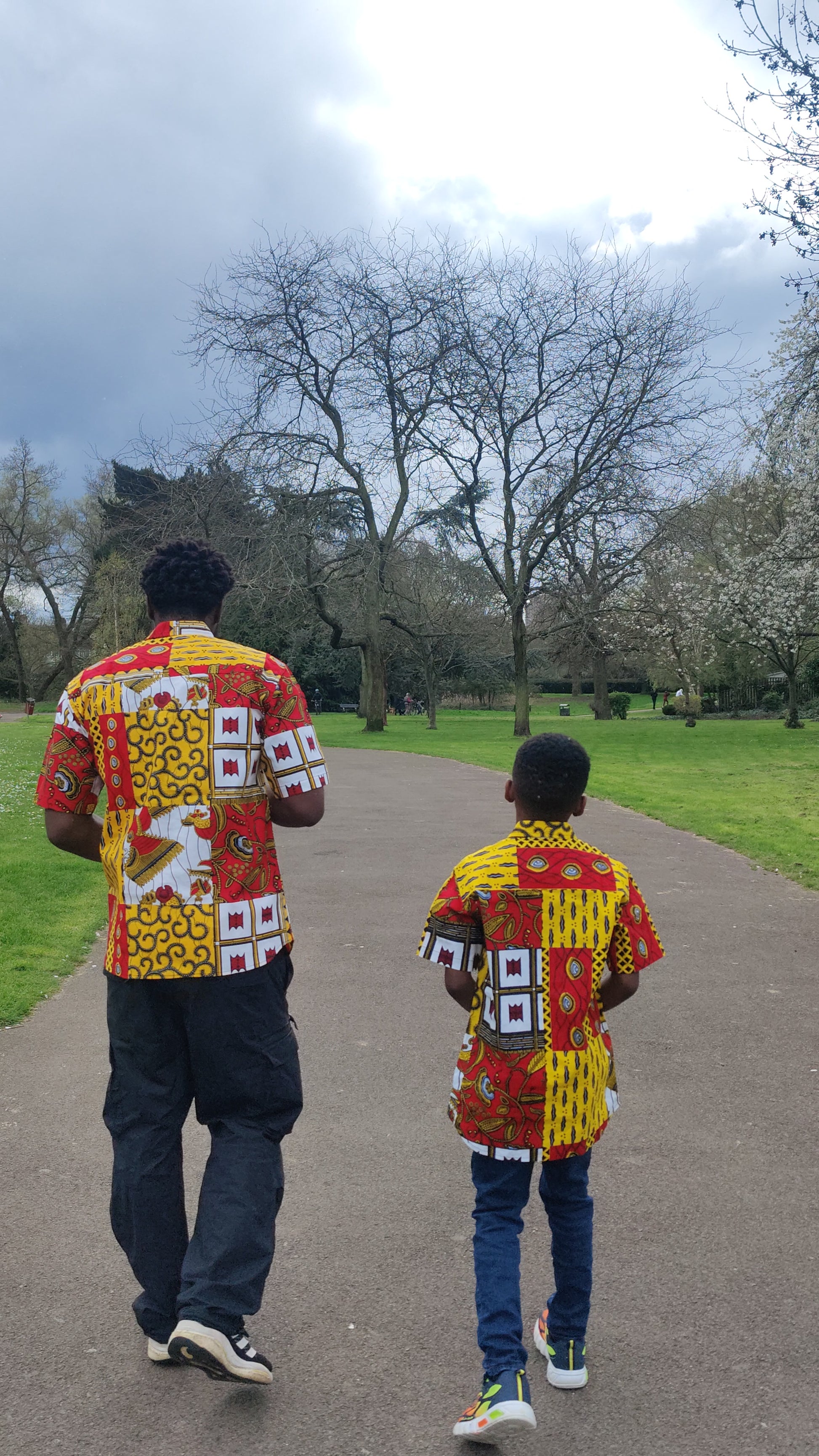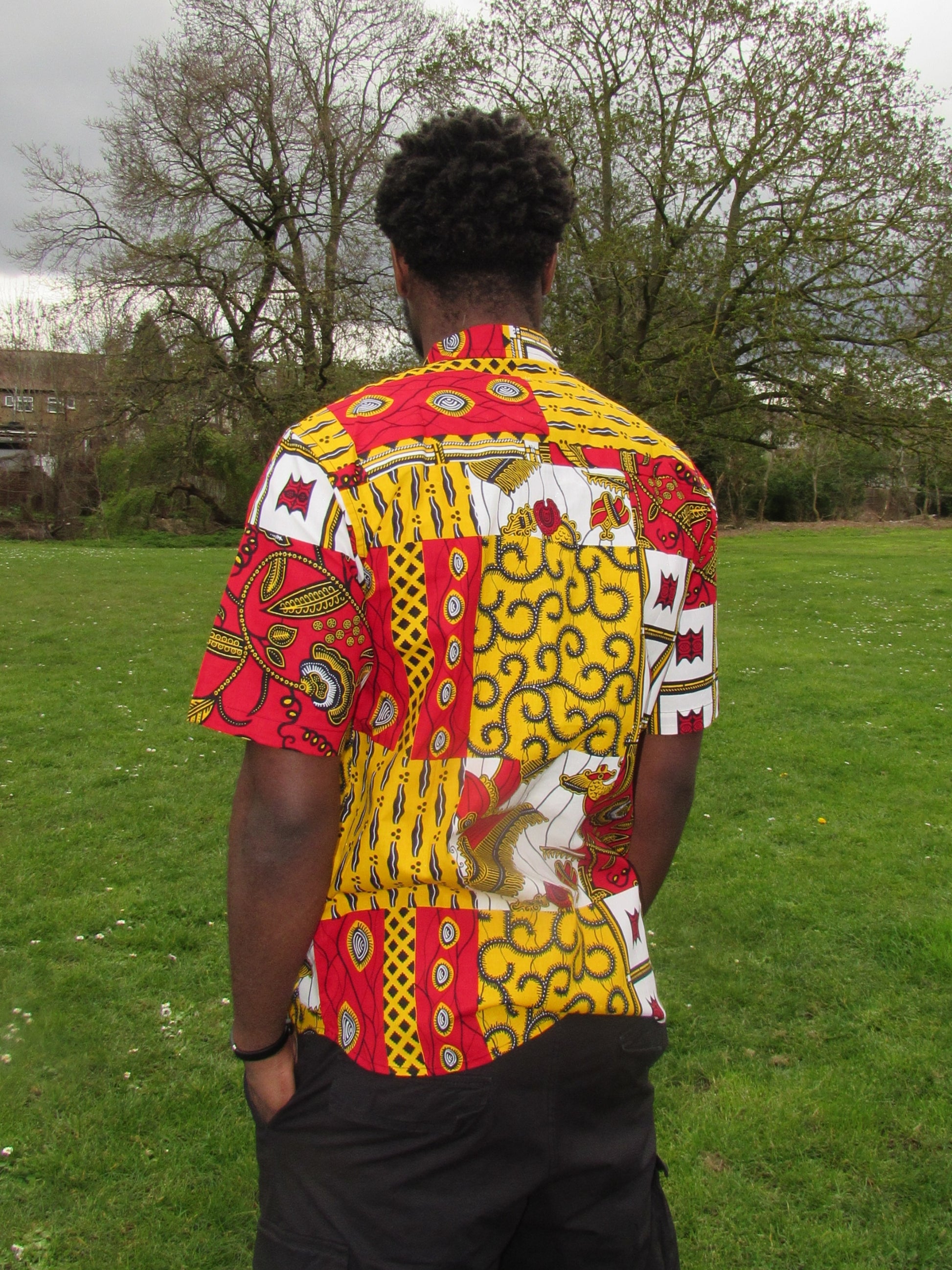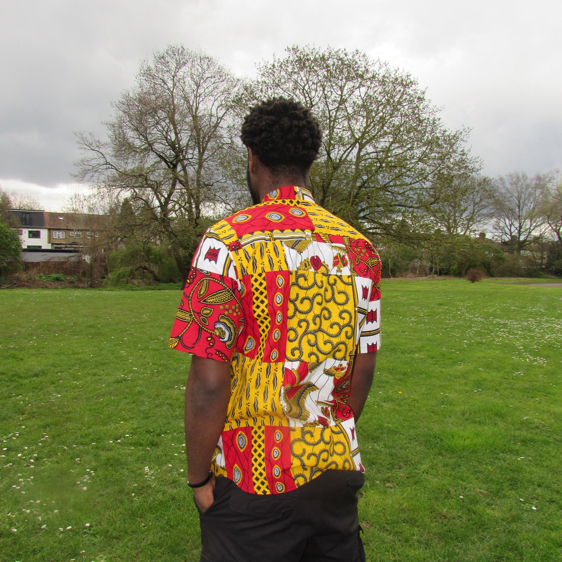 Get ready to make a statement with this Men's African Print Short Sleeve Shirt! Handmade with high-quality cotton from Ghana, this short sleeve shirt features neat stitches and front buttons. The vibrant colors in the fabric make it easy to pair with any shorts or trousers. For a casual look, throw on some khaki shorts or jeans. And for a more formal occasion, pair it with your favorite trousers. This shirt is versatile, stylish, and definitely a must-have for any wardrobe
