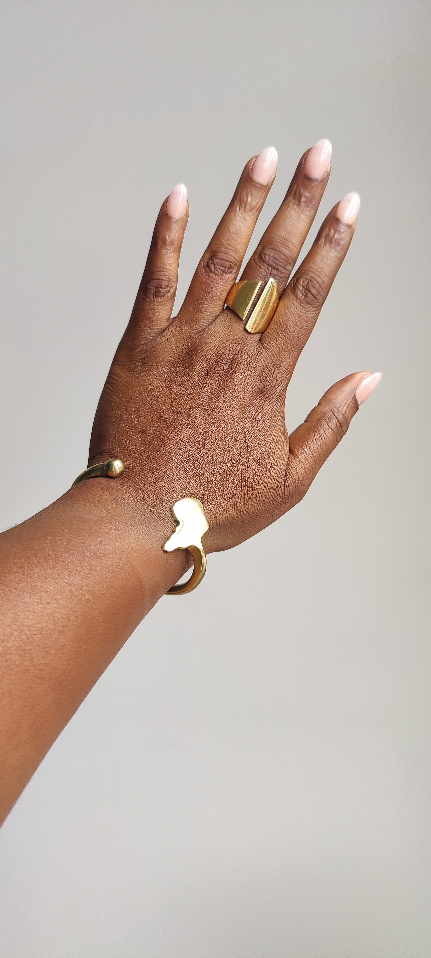 This adjustable ring has a large, modern design with a hand-polished golden brass finish and tarnish-resistant coating. Its geometric shape is perfect for a variety of contemporary looks. It is made of top-notch brass, an ideal piece for any jewelery collection.