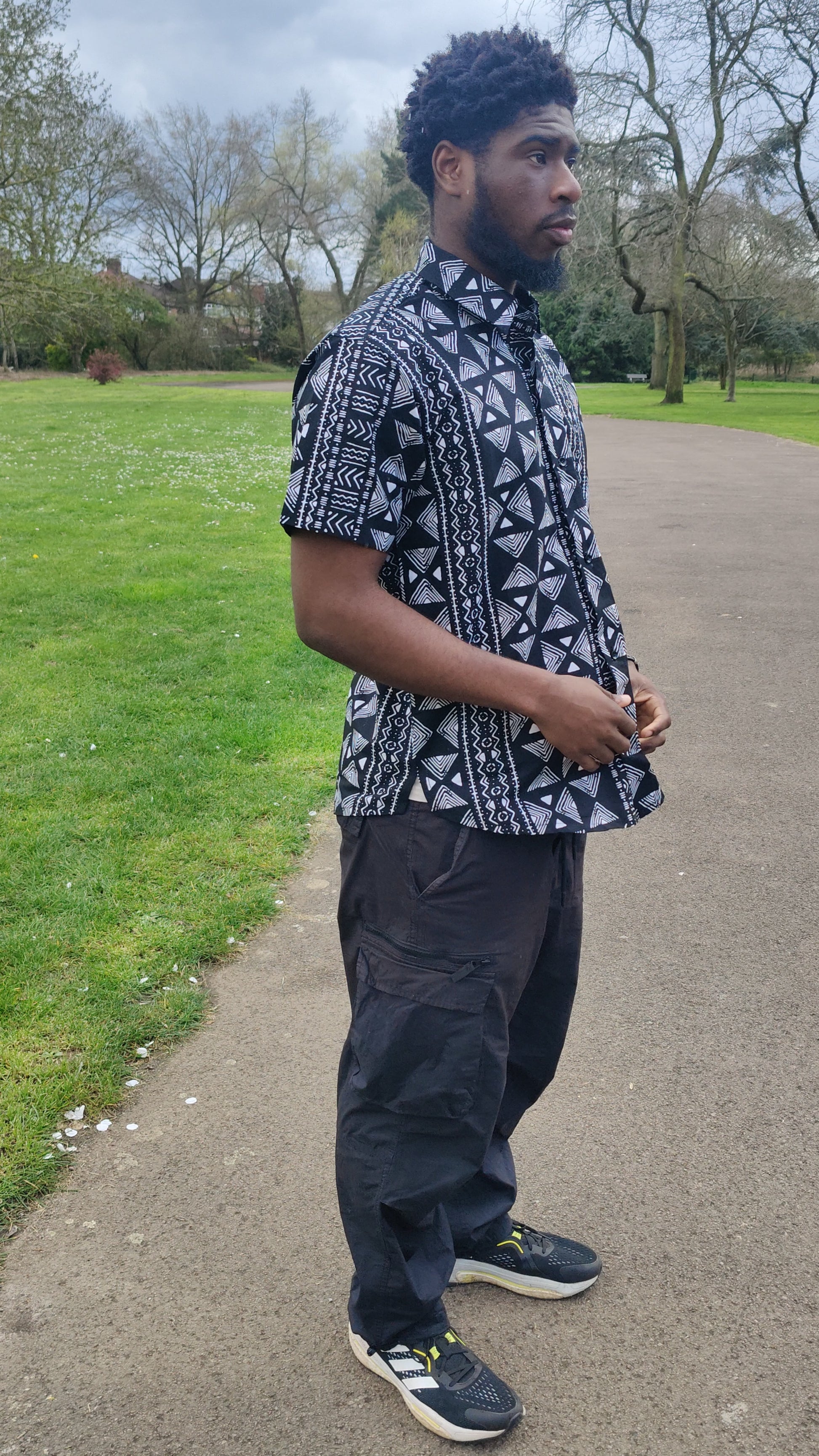 Get ready to make a statement with this Men's African Print Short Sleeve Shirt! Handmade with high-quality cotton from Ghana, this short sleeve shirt features neat stitches and front buttons. The vibrant colors in the fabric make it easy to pair with any shorts or trousers. For a casual look, throw on some khaki shorts or jeans. And for a more formal occasion, pair it with your favorite trousers. This shirt is versatile, stylish, and definitely a must-have for any wardrobe